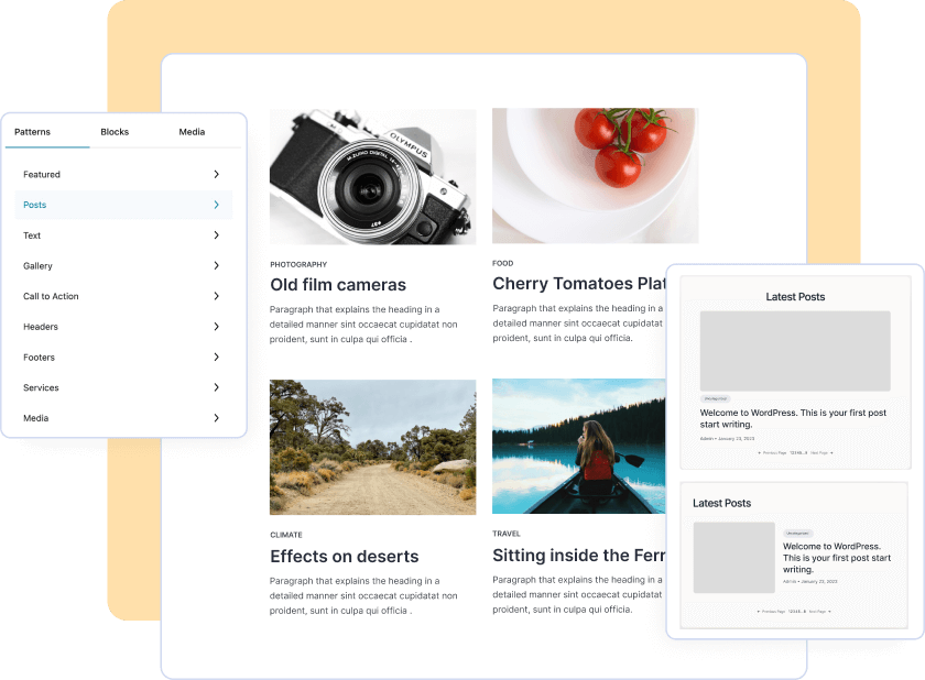 Los patrones de bloques son diseños de bloques prediseñados que podemos insertar fácilmente en el contenido. Estos patrones pueden ayudarnos a ahorrar tiempo y a crear diseños visualmente atractivos. Nos permite crear temas personalizados utilizando la plantilla basada en bloques.